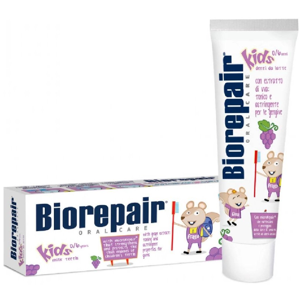 BioRepair Kids dětská zubní pasta obsahuje patentovanou formuli microRepair® (hydroxyapatit a ionty zinku). Ta remineralizuje zubní sklovinu, zpevňuje ji a chrání. Preventivně působí proti vzniku zubního plaku a zubního kazu, zpomaluje tvorbu zubního kamene. Doporučuje se také k remineralizaci zubní skloviny po odstranění fixních rovnátek.