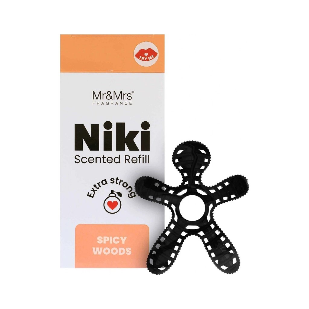 Náhradní náplň Mr&Mrs Fragrance Niki Spicy Woods Vaše autovůně NIKI už nevoní? Není nic snazšího než ji vyměnit za novou. Zavřete oči a ocitnete se v lese - přesně tak voní Spicy Woods (kořeněné dřevo). Dřevitá vůně, která Vás přenese do míst, kde je vzduch nejčistší. Hlava: bergamot, zelené jablko, koření Srdce: tabákový květ, anýz, muškátový oříšek, sečuánský pepř Základ: cedrové dřevo, guajakové dřevo, vanilka, ambra O značce Přemýšleli jste někdy nad tím, kolik hodin týdně strávíte v autě? Tak proč si cestování nezpříjemnit i pomocí vůně? Objevte s námi svět originálních vůní s italskou značkou Mr&Mrs Fragrance, která propojuje emoce, vzpomínky a estetický design v každém svém produktu. V naší nabídce naleznete široký sortiment vůní do auta, které promění váš vůz v místo plné pohody a stylu. Mezi nejoblíbenější produkty patří ikoničtí panáčci do auta Niki a Cesare, kteří vás zaujmou nejen svou vůní, ale i hravým a elegantním vzhledem. Všechny produkty jsou vyvíjeny ve spolupráci s renomovaným italským designérem Lucou Trazzi, díky čemuž získávají jedinečný vzhled a prémiovou kvalitu. Značka Mr&Mrs Fragrance klade důraz na bezpečnost a kvalitu. Používá 100% přírodní éterické oleje a splňuje normy IFRA (International Fragrance Association).