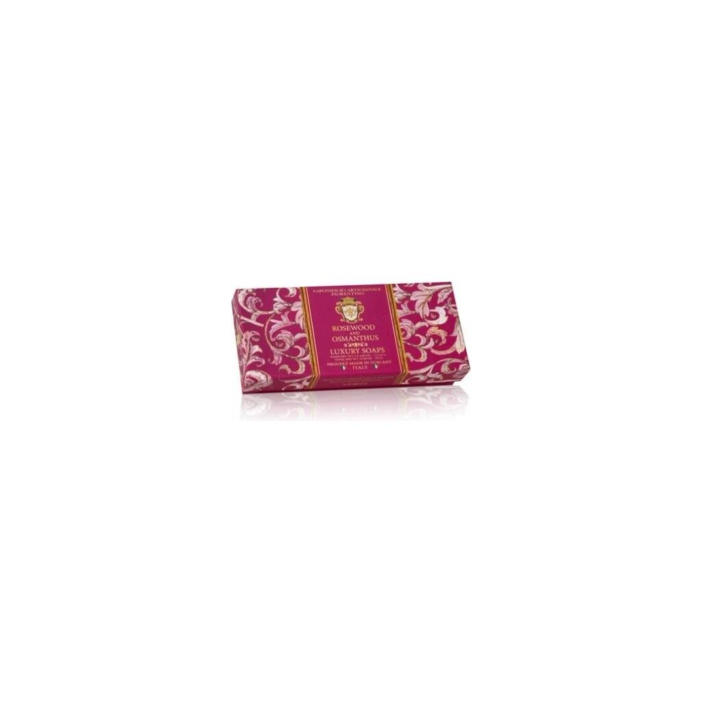 Saponificio Artigianale Fiorentino Rosewood and Osmanthus sada mýdel je luxusní kolekce, která přináší spojení dvou harmonických vůní – růžového dřeva a osmanthusu. Tato sada mýdel, vyrobená tradičním způsobem v Itálii, je nejen pečující, ale také nádherně vonící, což z každého mytí činí skutečný zážitek. Mýdla jsou bohatá na přírodní složky, které jemně čistí pokožku, zanechávají ji hydratovanou a jemně provoněnou.