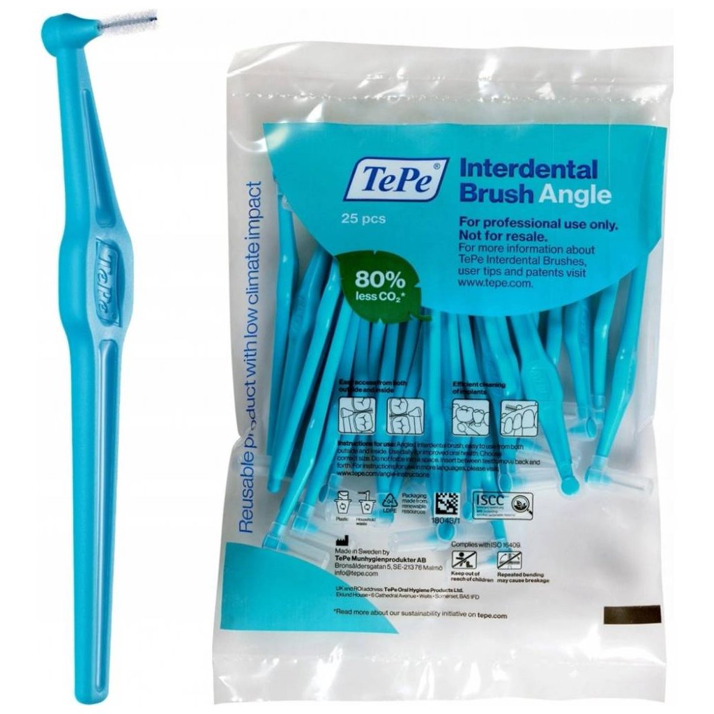 Štíhlá čistící hlava je zahnutá do pravého úhlu pro jednoduché dosažení zejména zadních mezizubních prostorů ze strany patra i jazyka. Tepe Angle je jednoduchý na použití, dlouhá, plochá rukojeť umožňuje přirozený, ergonomický úchop, podporující kontrolované a jisté pohyby.